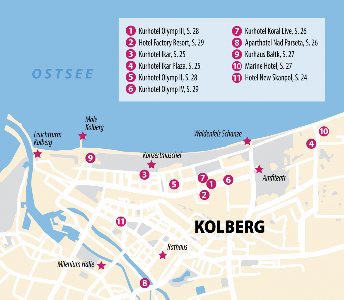 Seit über 200 Jahren ist Kolberg als Kurort bekannt. Sie finden einen sechs Kilometer langen Sandstrand samt dem Seebad vor. Der Nordteil in Kolberg, der entlang der Küste verläuft, bildet das Kurviertel mit den Kurhäusern und Naturheilanstalten. Im Sommer werden hier viele Kultur- und Unterhaltungsveranstaltungen organisiert. Kolberg hat ein einzigartiges Mikroklima. Das saubere Meer, ein breiter Dünenstreifen mit abwechslungsreichem Baumbestand und üppigen Grünanlagen gewährleisten den positiven und vielseitigen Einfluss auf den Körper. In der Luft, besonders am Strand, gibt es das auf die Gesundheit der Menschen positiv einwirkende Meeresaerosol, welches Salz- und Jodteilchen beinhaltet. Am Strand gibt es die größte Intensität der spürbaren strahlungsthermischen, Feuchtigkeits- u. mechanischen Klimareize. Das Mikroklima schafft ideale Inhalationsbedingungen und zeichnet sich durch den größten Besonnungsgrad in Polen aus. Der Himmel bleibt durchschnittlich 1.800 Stunden pro Jahr unbewölkt. Die größte Heilkraft entfaltet das Meeresklima mit seiner jod- und eisenhaltigen Seeluft im Winterhalbjahr!